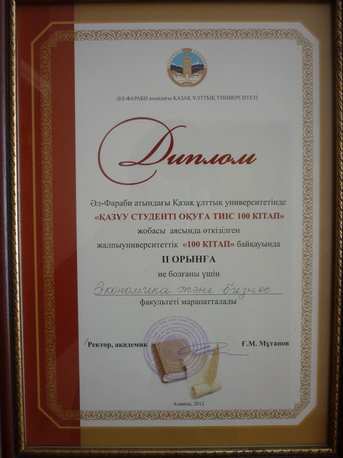 Diploma for the 2nd place in the university contest “100 kitap”.