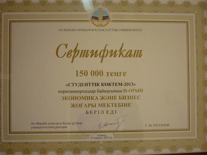 Certificate 150 000 tenge for the 2 place in the contest "Student Spring 2013"