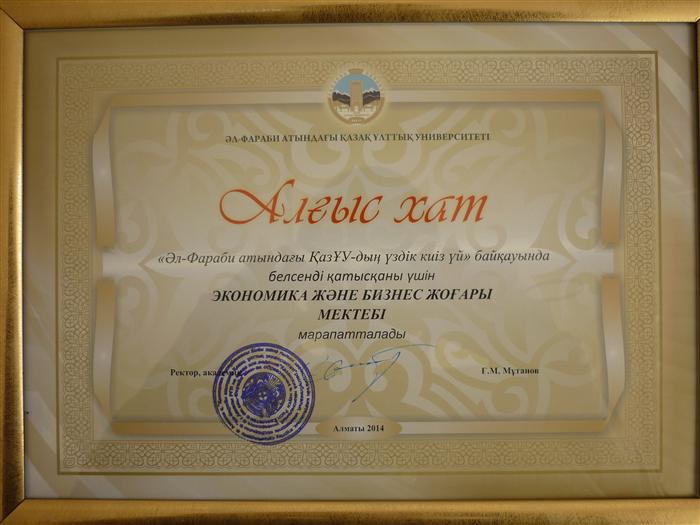 The letter of thanks for active participation "in the category Best yurt Kazakh National University. Al-Farabi" in 2014