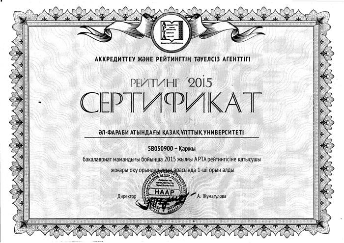 The specialty "Economics" based on the results of independent rating agency ARTA in the direction of bachelor level education took the first place in 2015 on the Republican level.