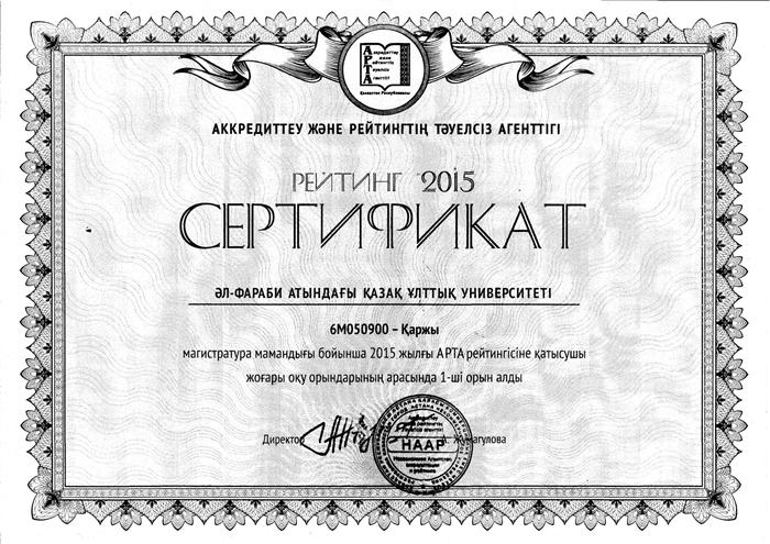 The specialty "Finance" based on the results of independent rating agency ARTA in the direction of master level education took the first place in 2015 on the Republican level. |