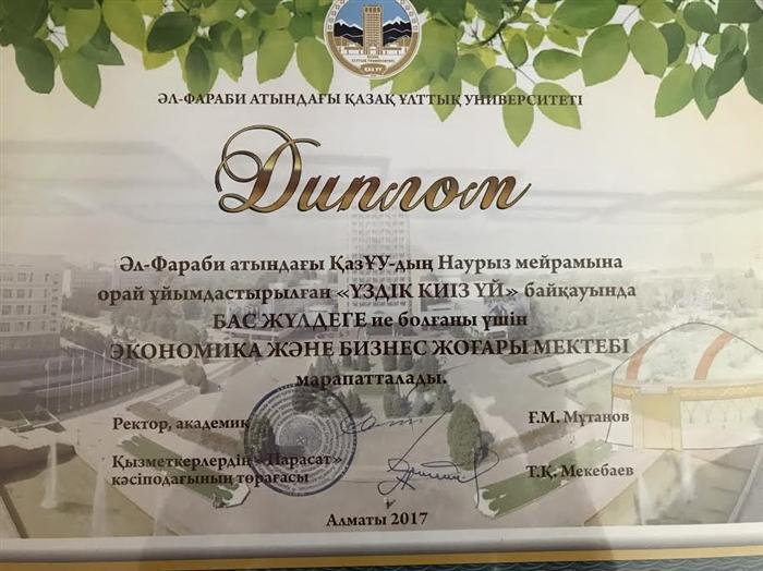 The first place in the nomination "Uzdik kiiz ui" on the holiday of Nauryz of KazNU named after Al-Farabi |