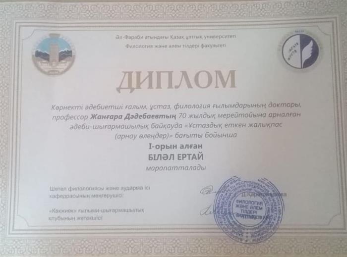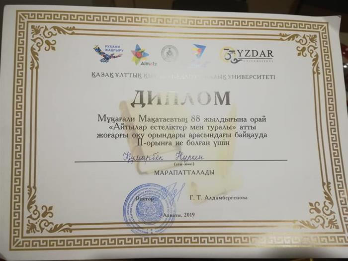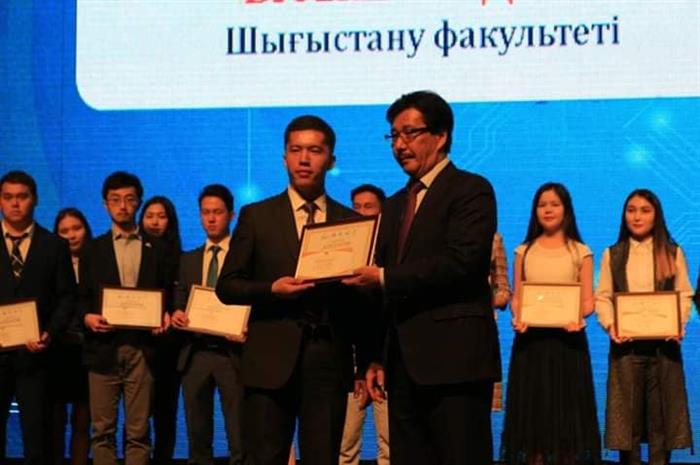 «5В020500 Филология: қазақ тілі» мамандығының 2 курс студенті Емешова Гүлдариғаның жұмысы ерекше деп танылып, ректорат тарапынан берілетін марапатқа ұсынылды. Тақырыбы: «М. Мағауин шығармаларындағы кей көне сөздердің мағыналық сипаты».
