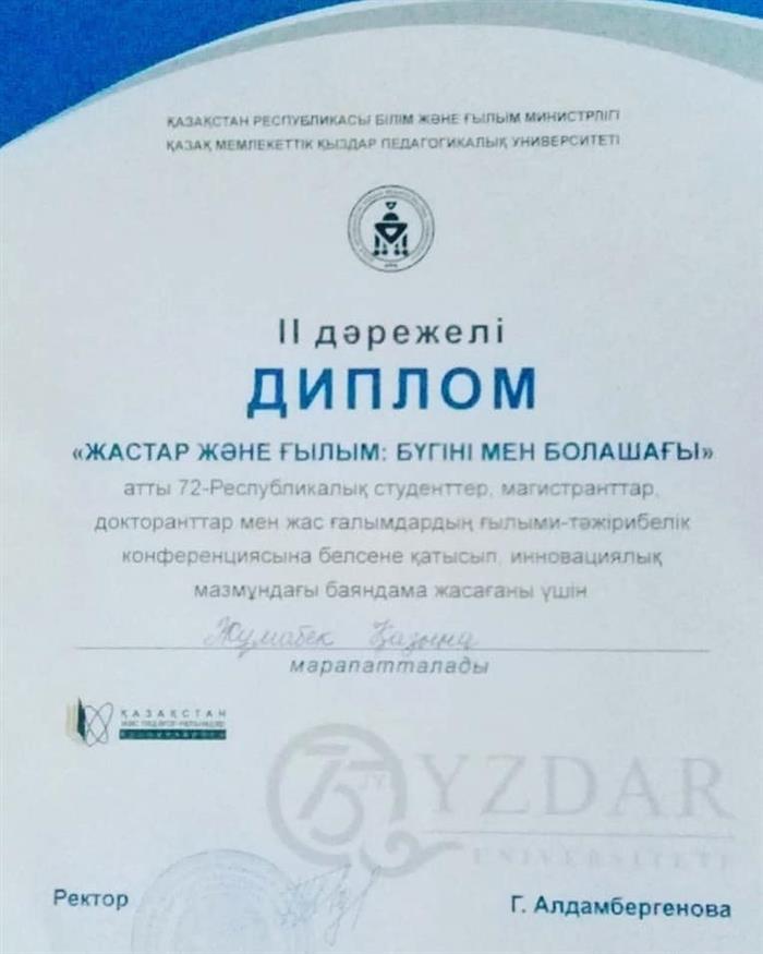 8-11 сәуір аралығында Әл-Фараби атындағы Қазақ ұлттық университетінде өткен студенттер мен жас ғалымдардың «Фараби әлемі» атты халықаралық ғылыми конференциясында 3-орынға ие болған 1-курс студенті Жұмабек Қазына тағы да жүлделі оралды . Ол қыздар университетінде өткен «Жастар және ғылым: бүгіні мен болашағы» атты 72 –Республикалық Студенттер, магистранттар, докторанттар мен жас ғалымдардың ғылыми-тәжірибелік конференциясына белсене қатысып, инновациялық мазмұндағы баяндама жасағаны үшін ІІ дәрежелі дипломмен марапатталды. Ғылыми жетекшісі: филология ғылымдарының докторы, профессор Анар Салқынбай. |
