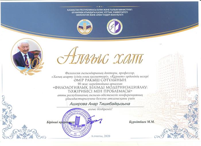 Филология ғылымдарының докторы, профессор Әмір Рақыш Сәтұлының 90 жас мерейтойына арналған "Филологиялық білімді модернизациялау: тәжірибесі мен проблемасы" атты республикалық ғылыми-әдістемелік конференцияның ұйымдастырылуына белсене атсалысқаны үшін Аширова Анар Тишибайқызы алғыс хатпен марапатталды. |