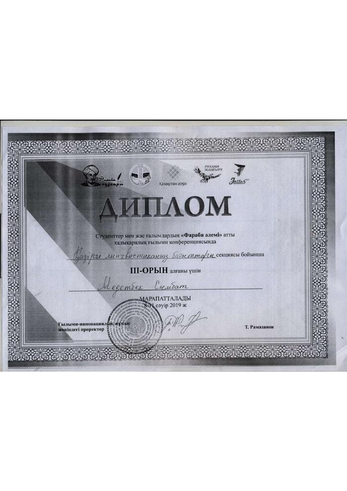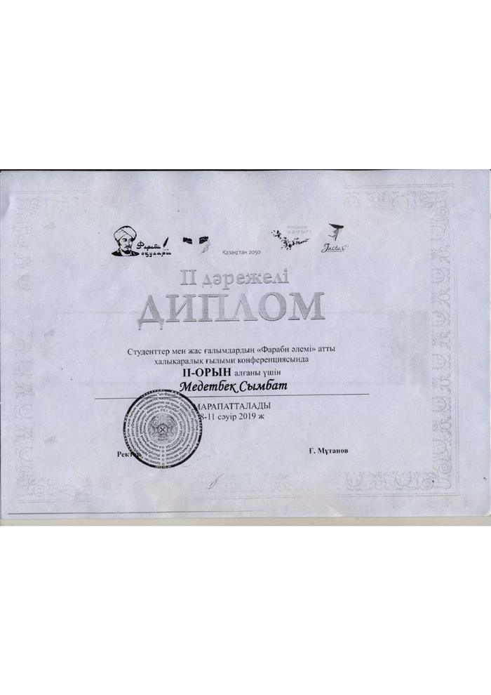 Диплом 2ой степени выдан Медетбек Сымбат за участие в международной научной конференции "Фараби әлемі". |
