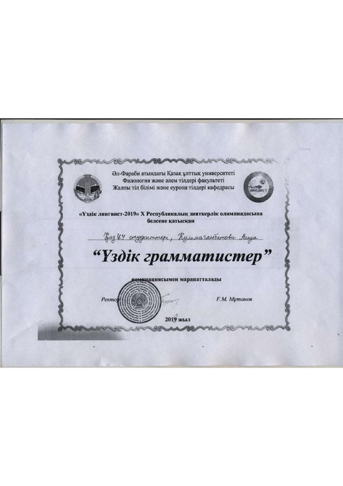 Диплом выдан Калмаганбетовой Аиде за участие в 10й Республиканской интеллектуальной олимпиаде "Үздік лингвист-2019". |
