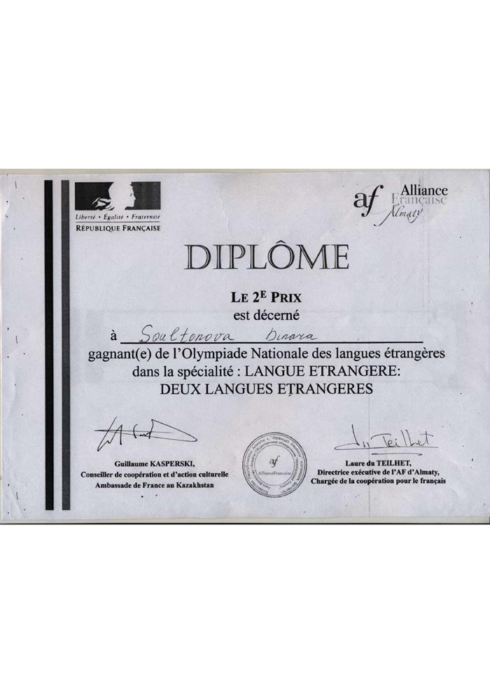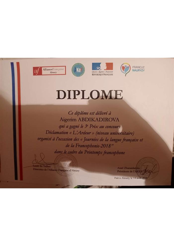 Диплом выдан Айгерим Абдикадыровой занявшей 3е место в олимпиаде по французскому языку. |