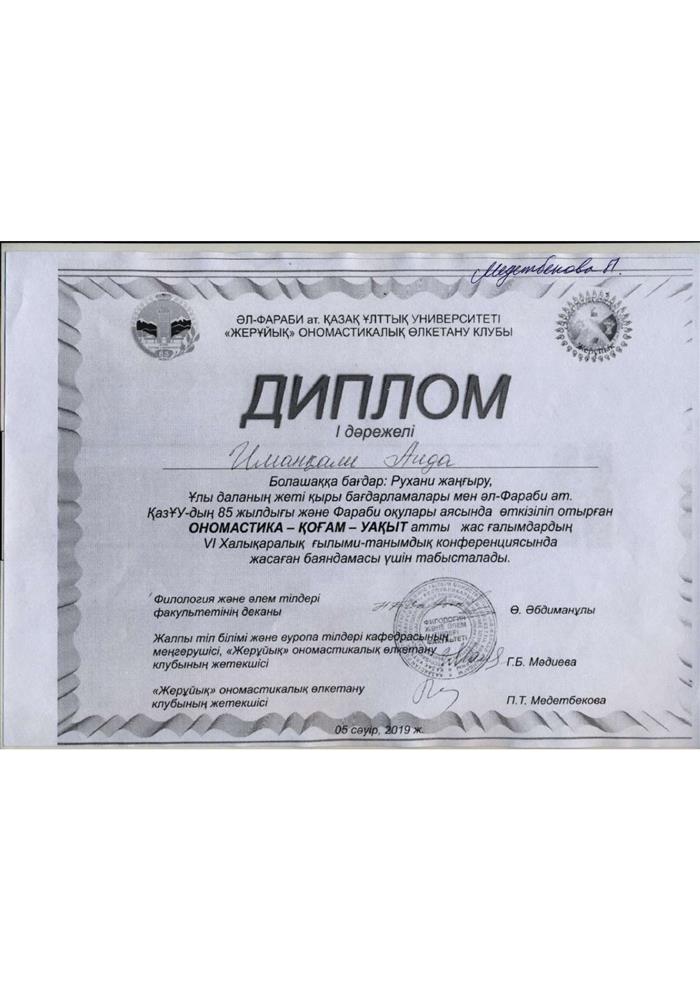 Диплом 1ой степени выдан Иманкали Аиде за участие в 6ой международной научно-познавательной конференции Ономастика-Қоғам-Уақыт |