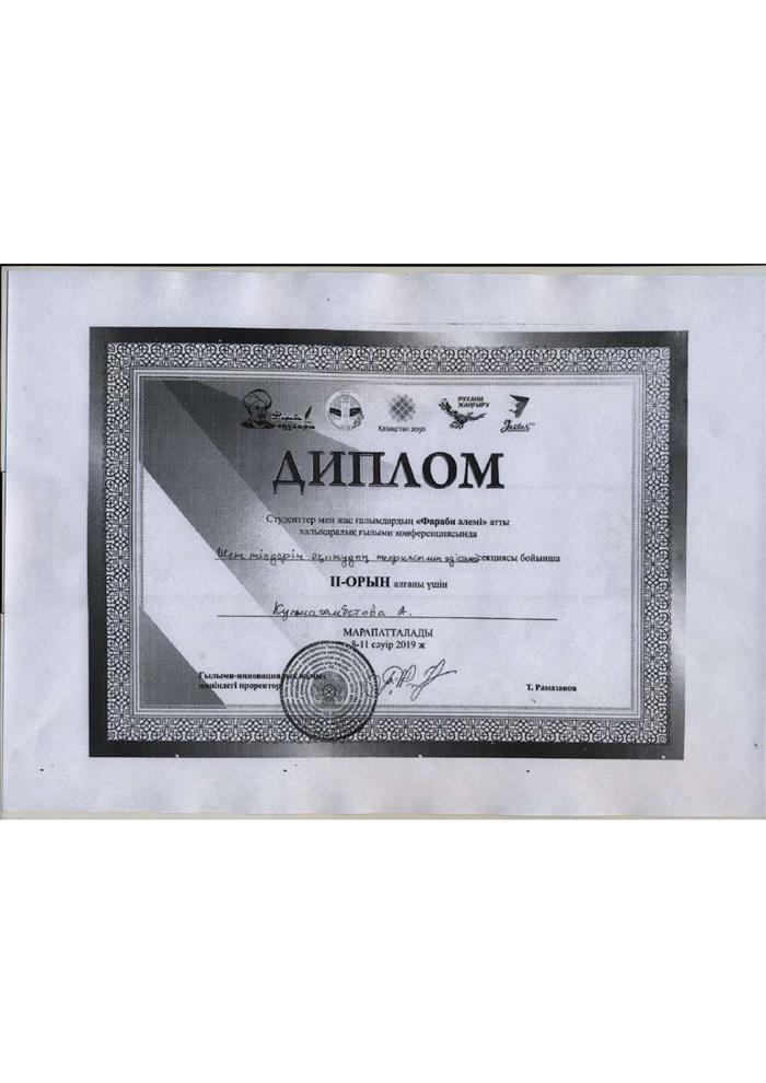 Диплом выдан Кулмаганбетовой Аиде занявшей 2е место в международной научной конференции студентов и молодых ученых "Фараби әлемі". |