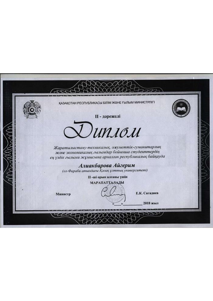 Алиакбарова Айгерим заняла второе место на республиканском конкурсе, посвященном лучшим научным работам студентов в области естественно-технических, социально-гуманитарных и экономических наук, и была награждена дипломом 2-ой степени.