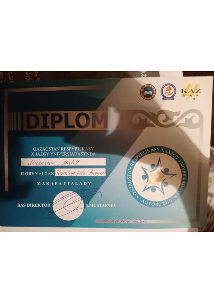 Диплом выдан Абдикадыровой Айгерим занявшей 2е место в 10ой летней универсиаде. |